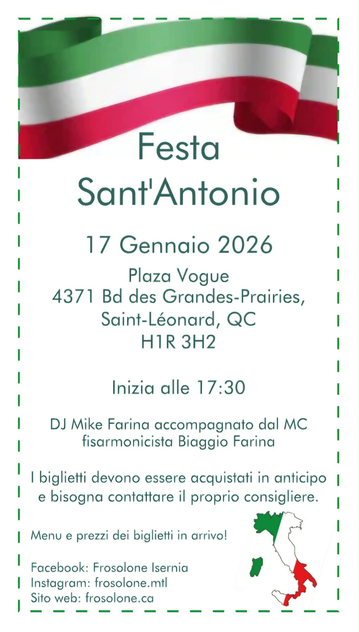 Sarà una Festa di Sant'Antonio speciale, che celebrerà i 50 anni di amicizia e cultura Frosolonese in Montreal. Celebriamo i nostri membri fondatori, i devoti membri del consiglio nel corso degli anni e, soprattutto, la nostra ricca cultura Frosolonese circondati da amici e familia.